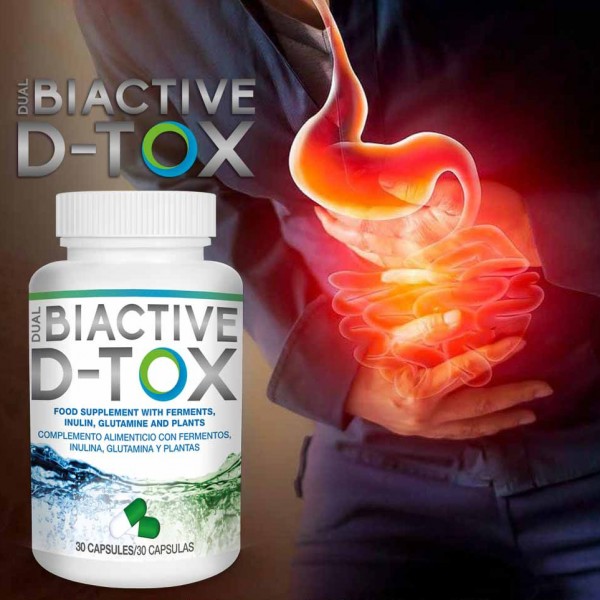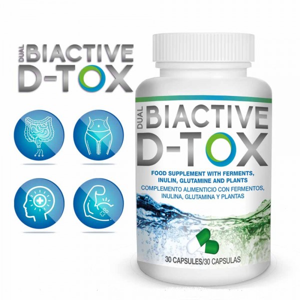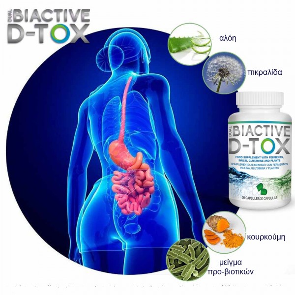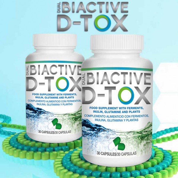 Το Dual Biactive D-Tox είναι ένα συμπλήρωμα διατροφής φυσικής προελεύσεως με ένα μείγμα προβιοτικών φυσικών συστατικών (κουρμουμά, φύλλα αλόης, κολλιτσίδα, πεπτικά ένζυμα, σπόρους μπανάνας και εκχυλίσματα πικραλίδας, μαράθου, φουμαριάς και αγκινάρας).