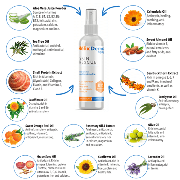 Η μοναδική φόρμουλα του Helix derma ανακουφίζει από τα συμπτώματα διαφόρων δερματικών προβλημάτων όπως έκζεμα, ψωρίαση, δερματίτιδα, κνίδωση, φαγούρα ή ξηρό δέρμα. Η αποκλειστική φόρμουλα του Helix Derma περιέχει φυσικά συστατικά γνωστά για τις ιδιότητές τους: