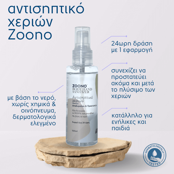 Τα αντισηπτικά χεριών & σώματος ZOONO® παρέχουν εξαιρετικά αποτελεσματική προστασία μακράς διαρκείας, από ένα ευρύ φάσμα μικροβίων, συμπεριλαμβανομένου και του κορωνοϊού. Μόλις εφαρμοστεί, το ZOONO® παραμένει ενεργό έως και 24 ώρες στο δέρμα!